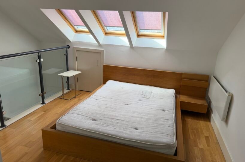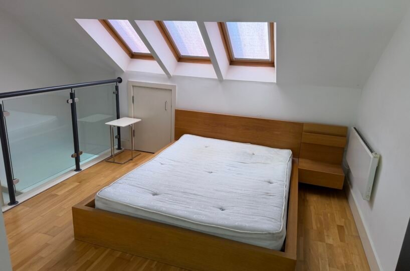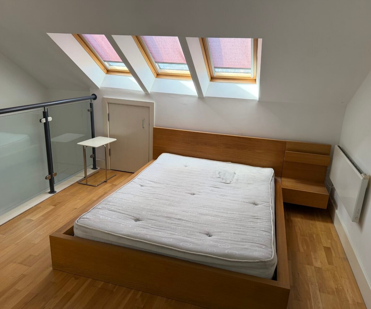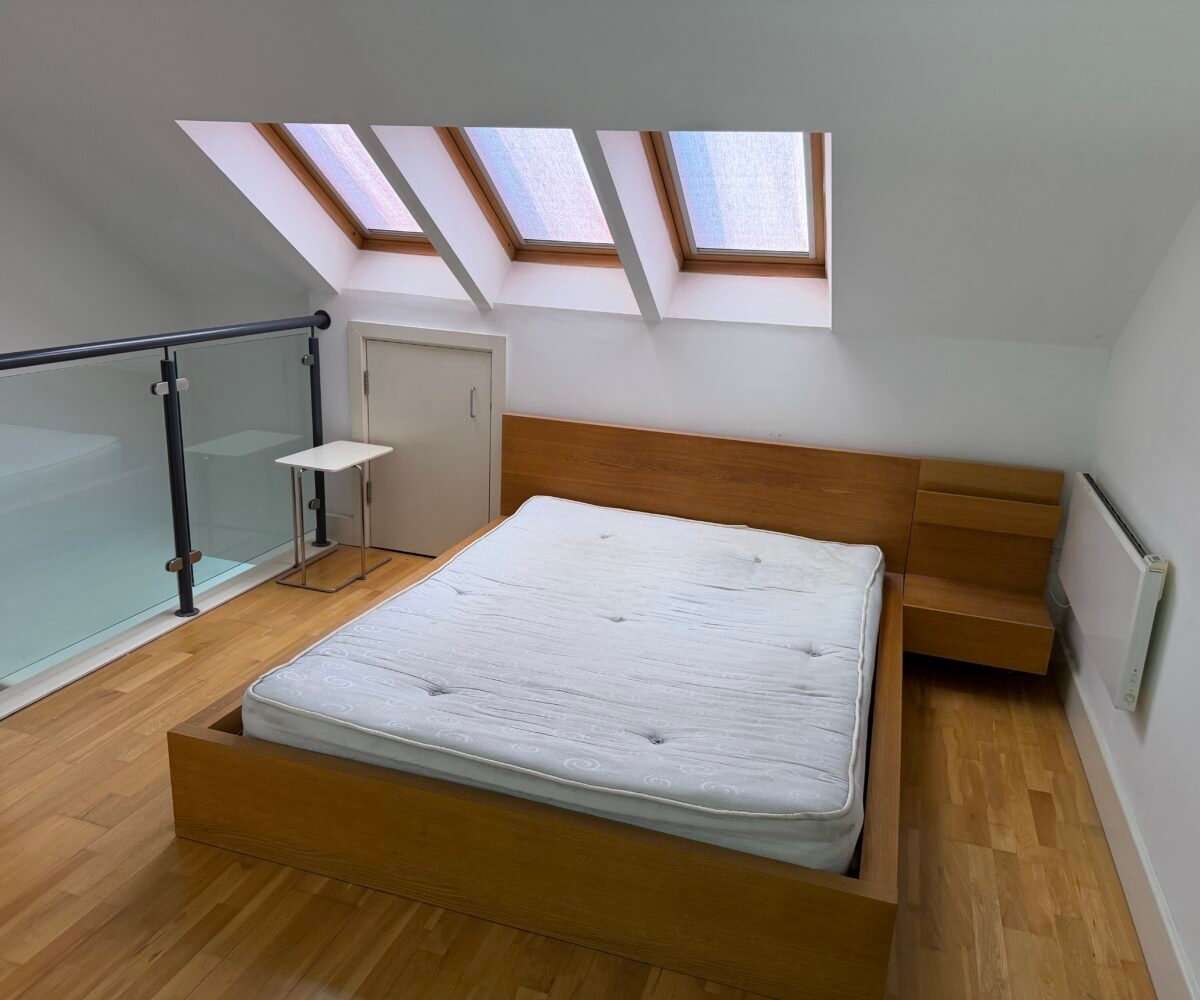 Stairs to mezzanine fully furnished double bedroom with 3 velux roof windows, large storage area and glass balcony overlooking living area. Apartments benefit from the additional ensuite shower room.