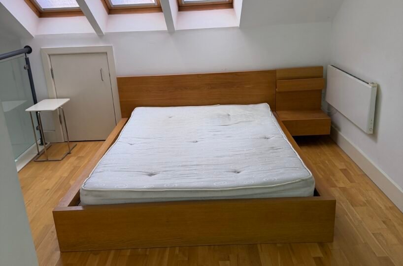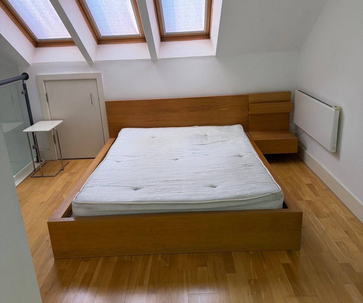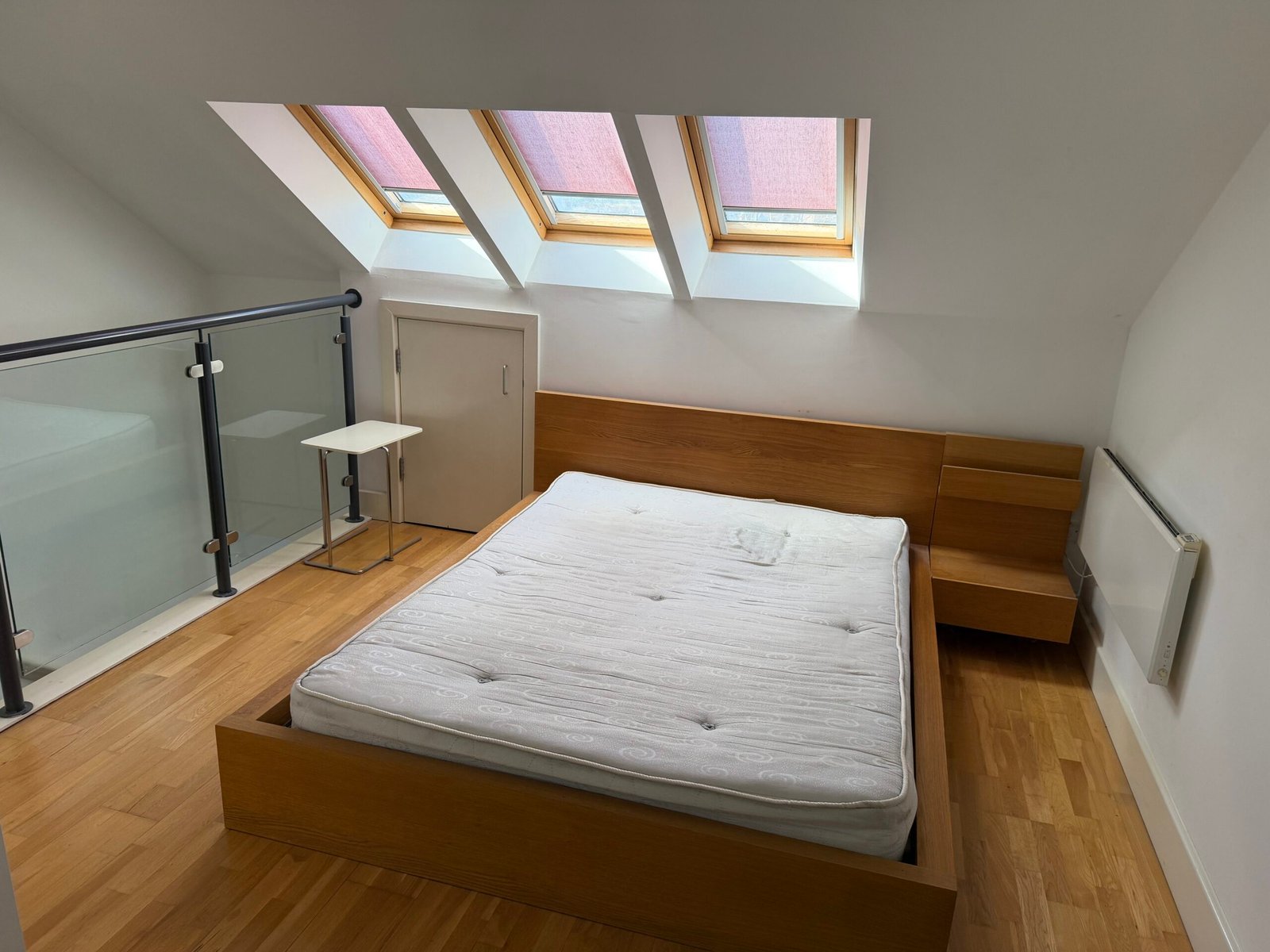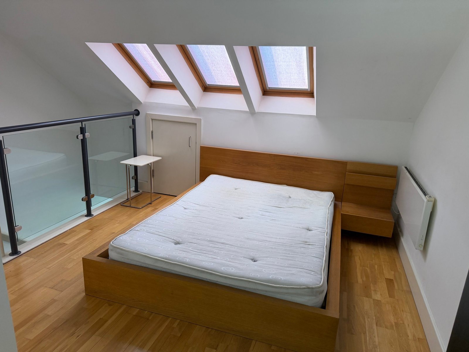 Stairs to mezzanine fully furnished double bedroom with 3 velux roof windows, large storage area and glass balcony overlooking living area. Apartments benefit from the additional ensuite shower room.