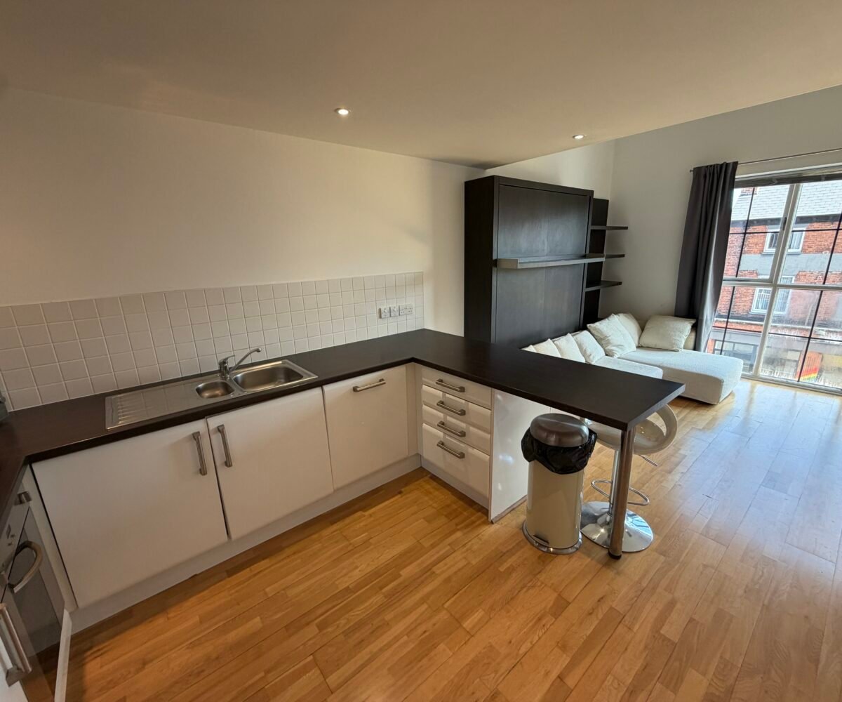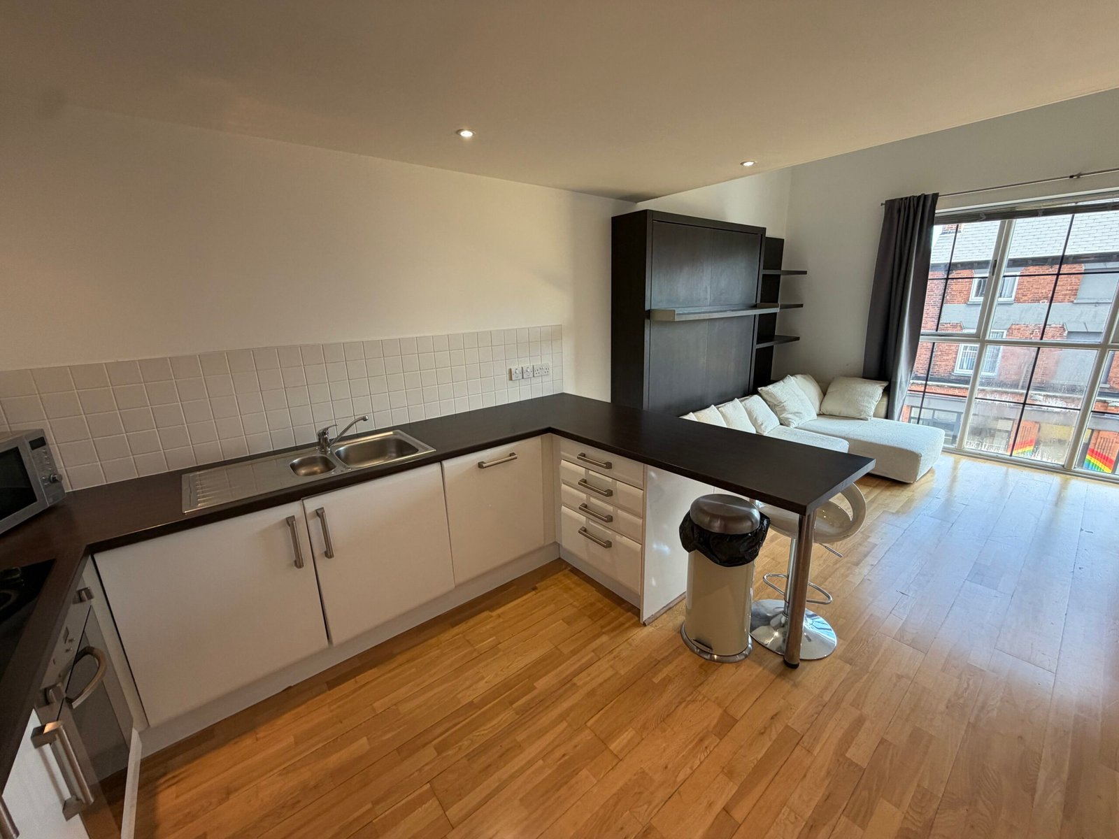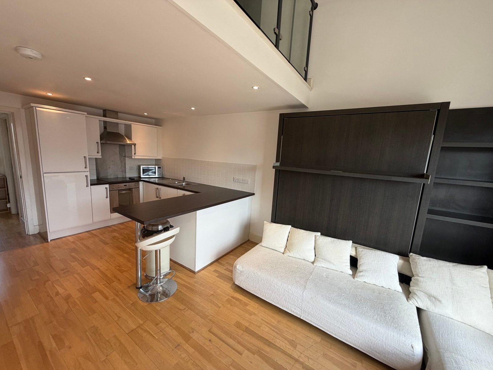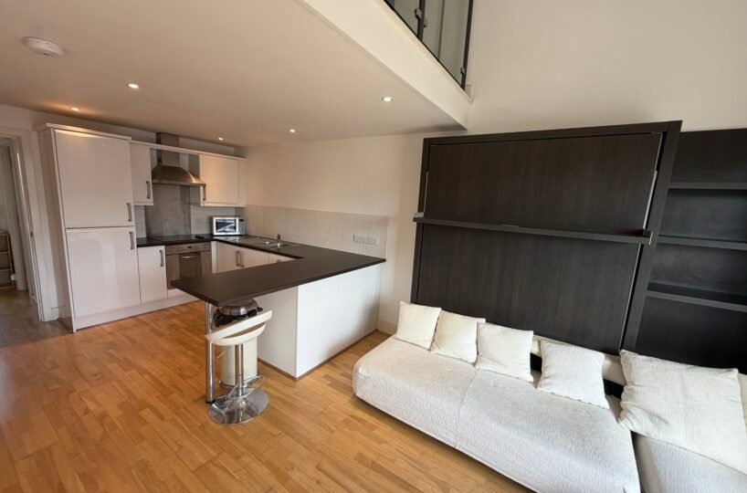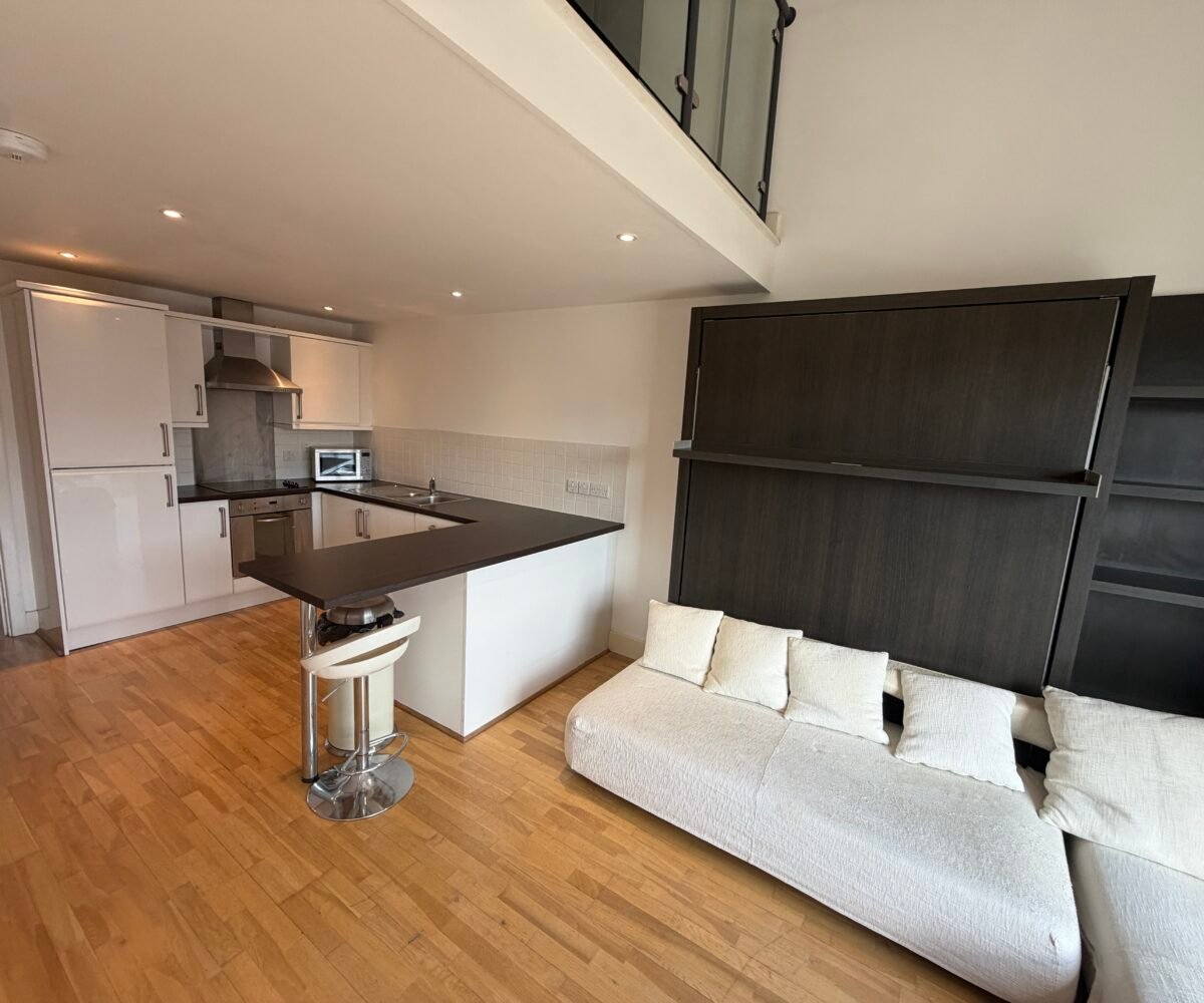 Villency Court modern duplex apartments have living dining kitchens with breakfast bar, built in fold-away double sofa-bed, large floor to ceiling window, understairs storage room and oak wooden flooring throughout.