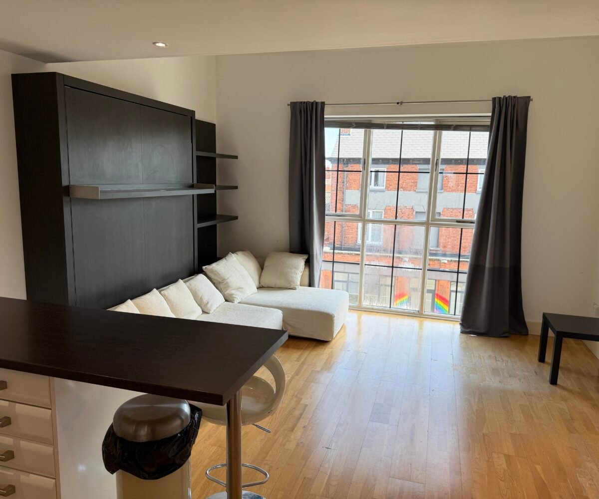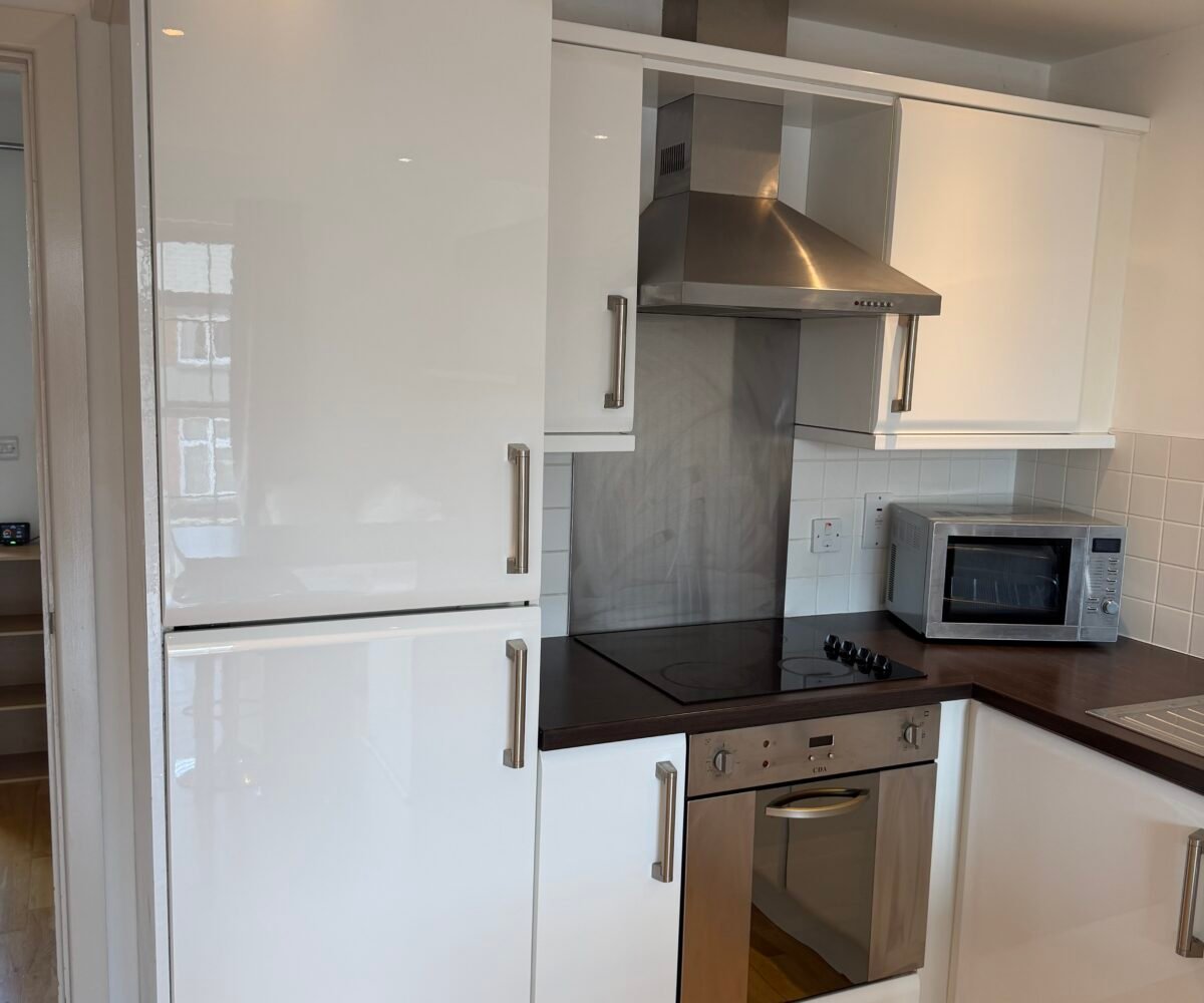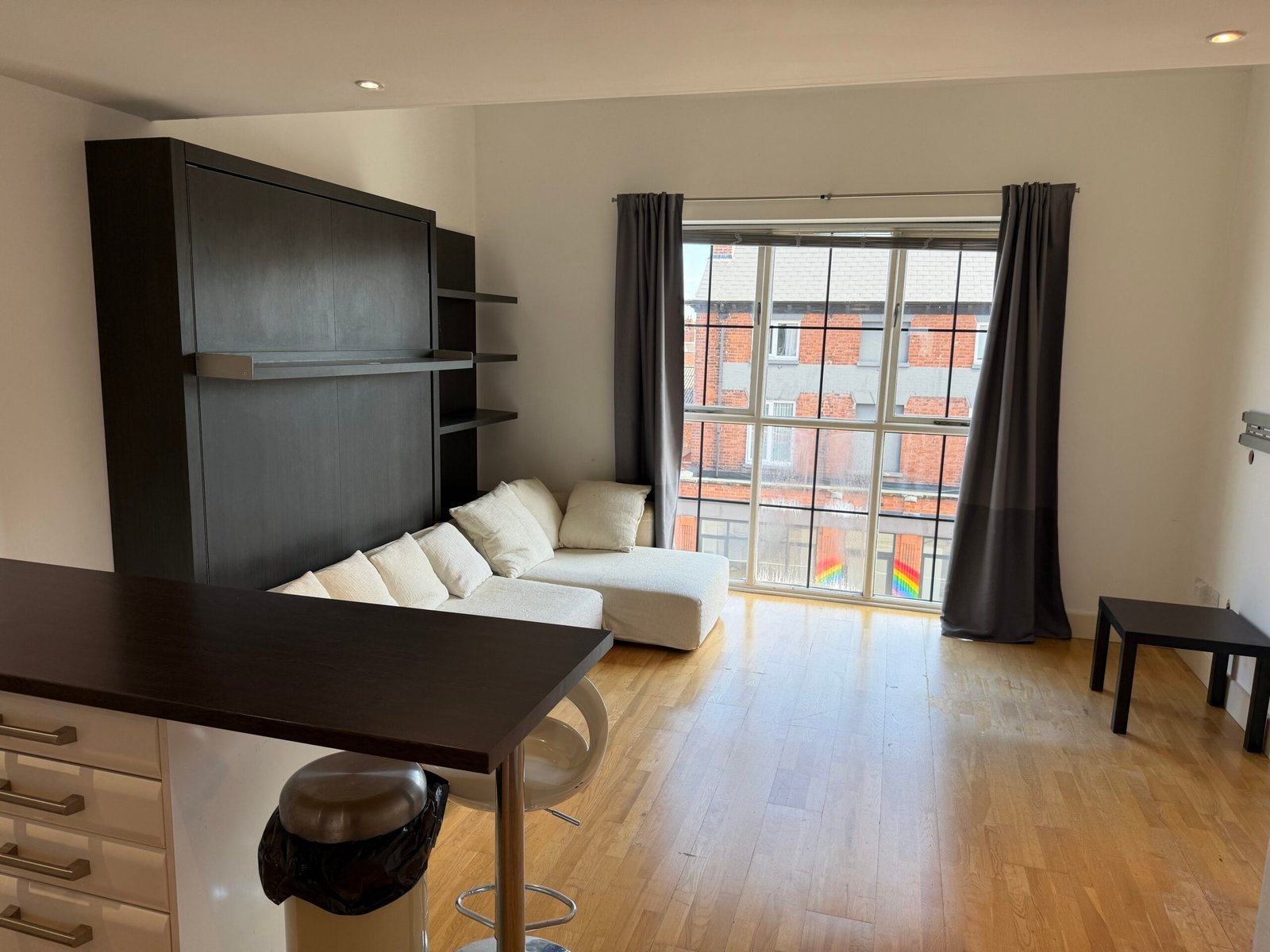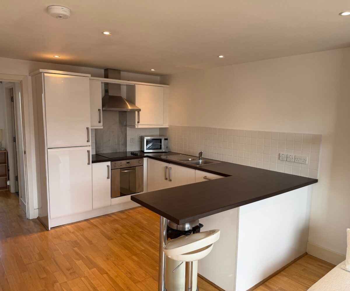 Villency Court modern duplex apartments have living dining kitchens with breakfast bar, built in fold-away double sofa-bed, large floor to ceiling window, understairs storage room and oak wooden flooring throughout.