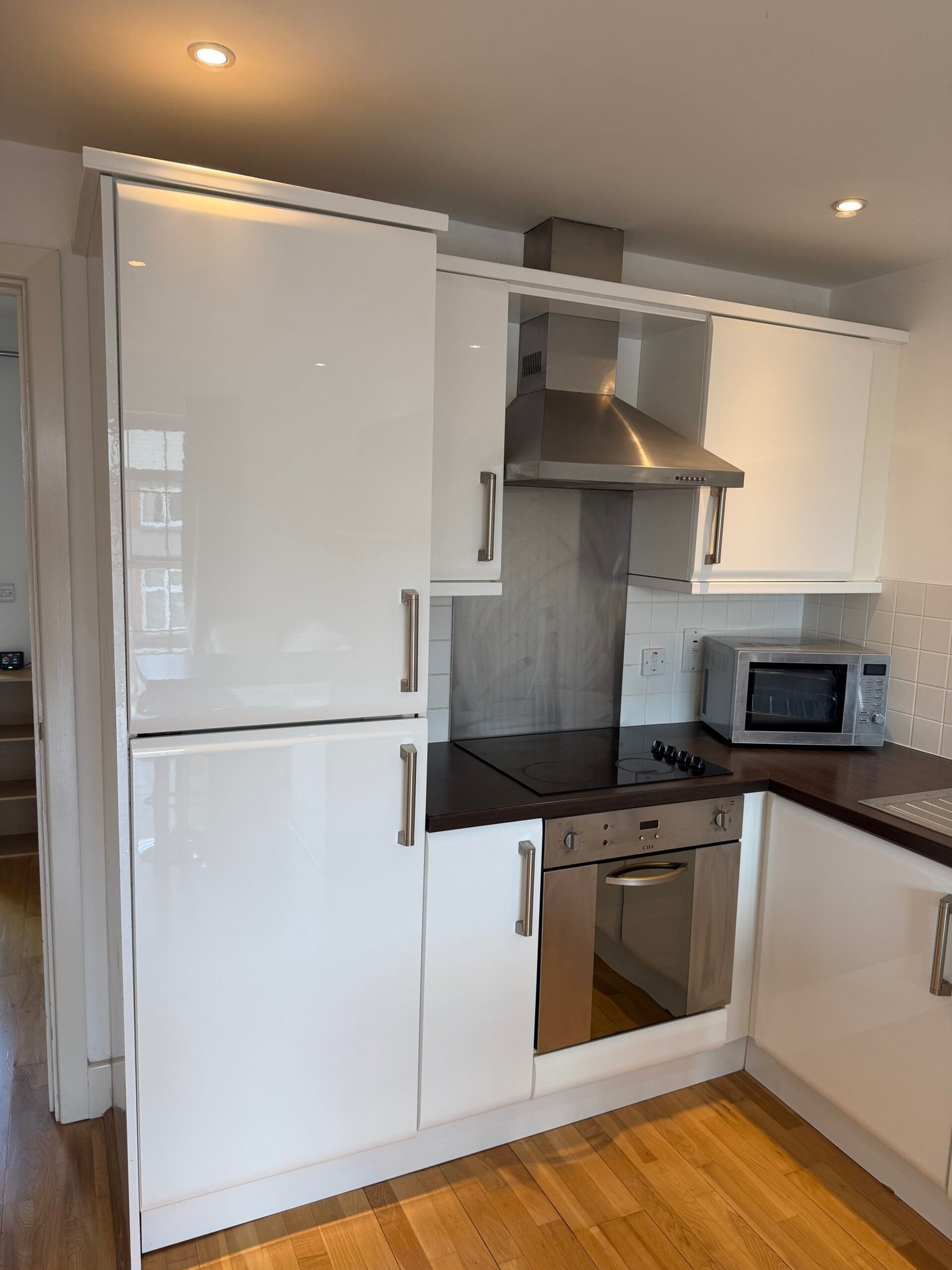 Luxury high gloss white kitchen with all built-in appliances, including ceramic electric hob and oven, fridge/freezer, washer dryer, dishwasher.
